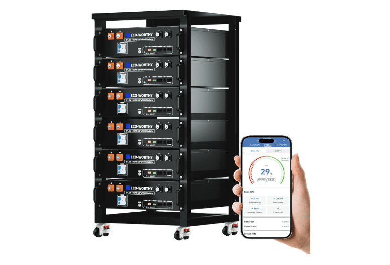 The ECO-WORTHY 48V server rack battery offers wireless monitoring via Bluetooth or Wi-Fi through a mobile app, allowing effortless real-time status tracking. Designed for standard 3U cabinets, its compact 100 lb. unit supports vertical stacking and over 32 parallel connections for scalable energy storage. Built with A-grade cells, a rugged metal housing, 100A BMS, 125A air switch, and power switch, it ensures long-lasting performance and enhanced safety. The battery comes fully equipped with parallel wiring, communication cables, protective caps, and installation accessories, and is backed by a 10-year warranty for reliable, ready-to-use operation.