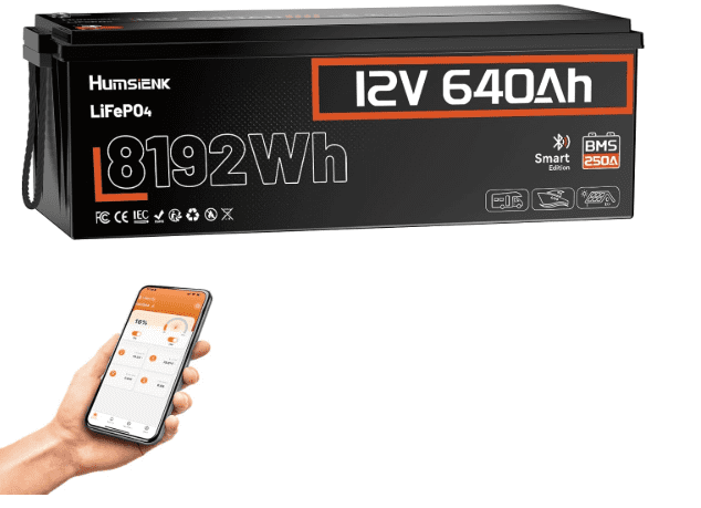 The HumsiENK 12V 640Ah LiFePO4 battery delivers 8,192Wh of high-capacity power, perfect for extended use in RVs, solar systems, boats, and off-grid setups. Equipped with a 250A BMS and stable LiFePO₄ chemistry, it safeguards against overcharge, over-discharge, short circuits, and extreme temperatures. Bluetooth monitoring via the dedicated app allows real-time tracking of voltage, current, and state of charge. Despite its massive capacity, its compact, lightweight design (50 kg / 110 lbs) makes installation and expansion simple, supporting series and parallel connections for scalable energy systems. Fast recharging options and a 5-year warranty with reliable support ensure peace of mind for all leisure and auxiliary power needs.