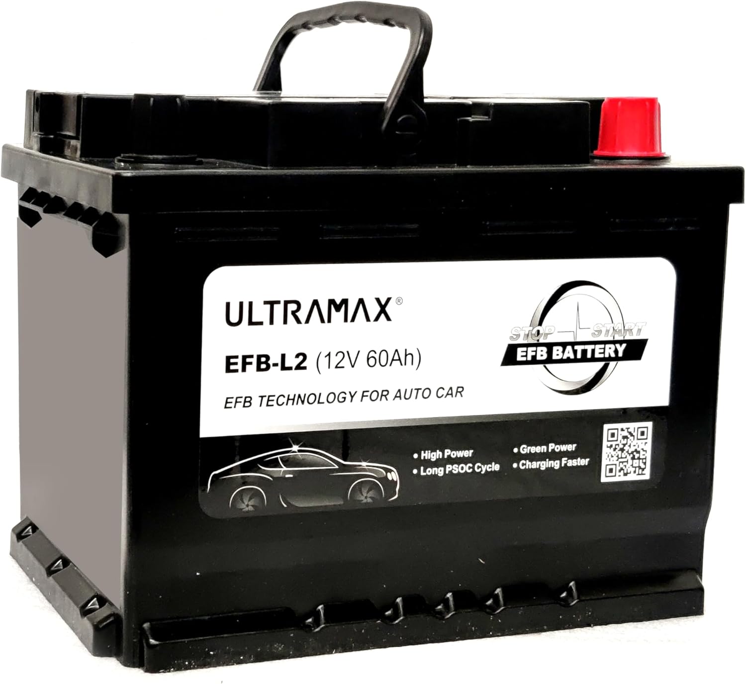 The Ultramax EFB-L2 12V 60Ah 640CCA AGM Plus Start-Stop Car Battery is engineered for high-specification vehicles featuring advanced technologies such as start-stop systems, regenerative braking, and energy recovery. Delivering very high cranking power compared to conventional batteries, it ensures reliable performance and long service life, supporting up to approximately 360,000 engine starts. This premium extra heavy-duty EFB battery offers increased cyclic durability, making it ideal for frequent stop-start driving. Designed to be leakproof and spillproof, it also includes an integrated flame arrestor for enhanced safety. By supporting efficient energy management, it helps reduce fuel consumption and lower emissions. With compact dimensions of 242mm x 175mm x 190mm (including posts), it provides a dependable, high-power solution for modern automotive demands, offering more power than standard AGM alternatives.