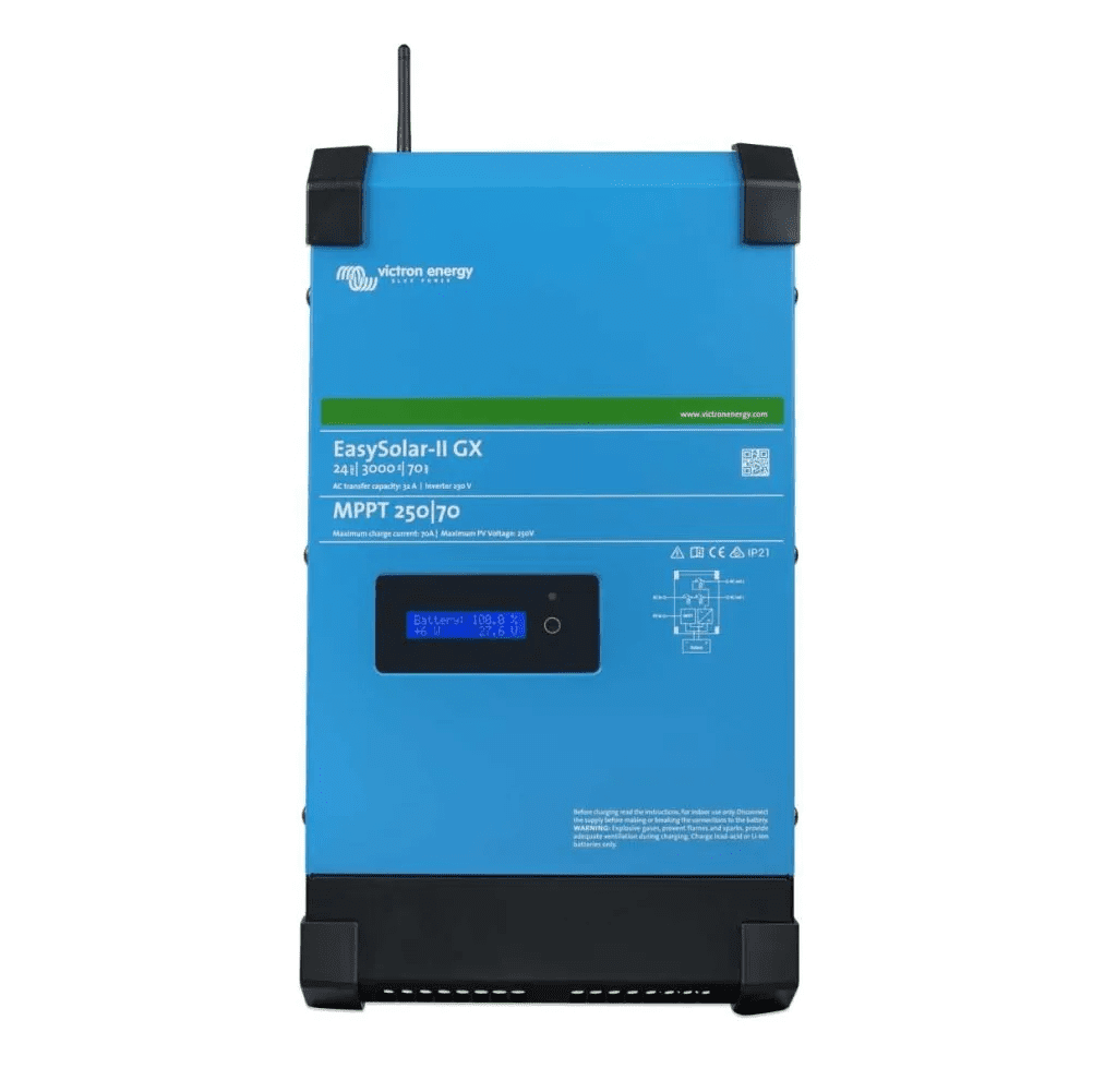The Victron Energy EasySolar-II GX is an all-in-one solar power solution that integrates a SmartSolar MPPT charge controller, a MultiPlus-II inverter/charger, and a control hub in a single enclosure. Its DC output is parallel-wired with the MultiPlus-II, and the inverter/charger’s on/off mechanism also controls the MPPT. The built-in display shows battery, inverter, and solar parameters, which can also be accessed and managed remotely via Wi-Fi on a smartphone or other device. Using VE.Bus and VE.Direct connections, the GX seamlessly manages both the inverter/charger and MPPT controller, and its simplified design allows for easy installation with minimal wiring.