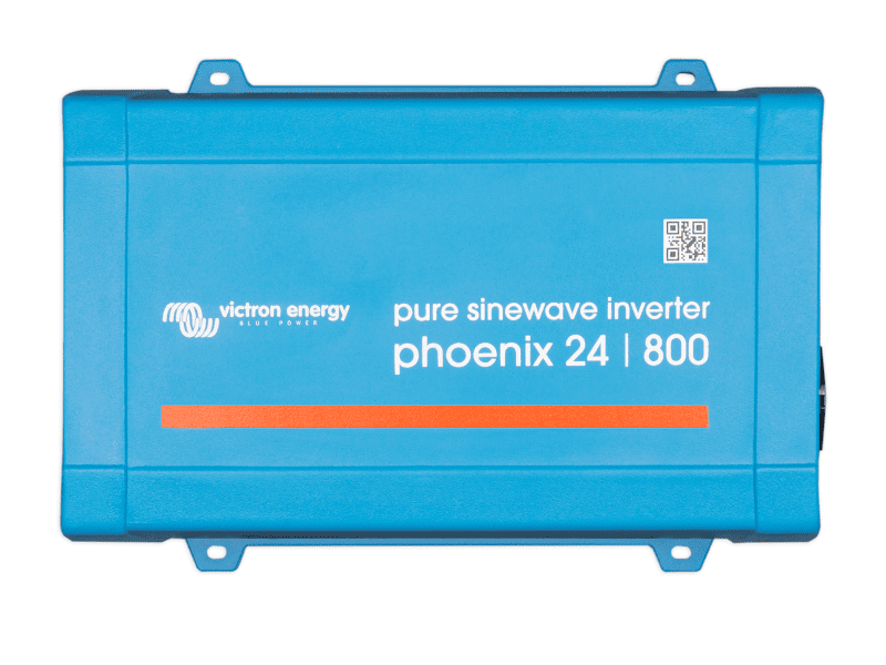 The Victron Energy Inverter converts 24V DC battery power into stable 230V AC with a pure sine wave output, delivering 800W continuous and 1500W peak power. It is compact, lightweight, highly efficient, and supports high start-up loads, with ECO mode reducing consumption to just 1.5W at no load. The VE.Direct port enables easy monitoring and control via smart devices (accessories sold separately).