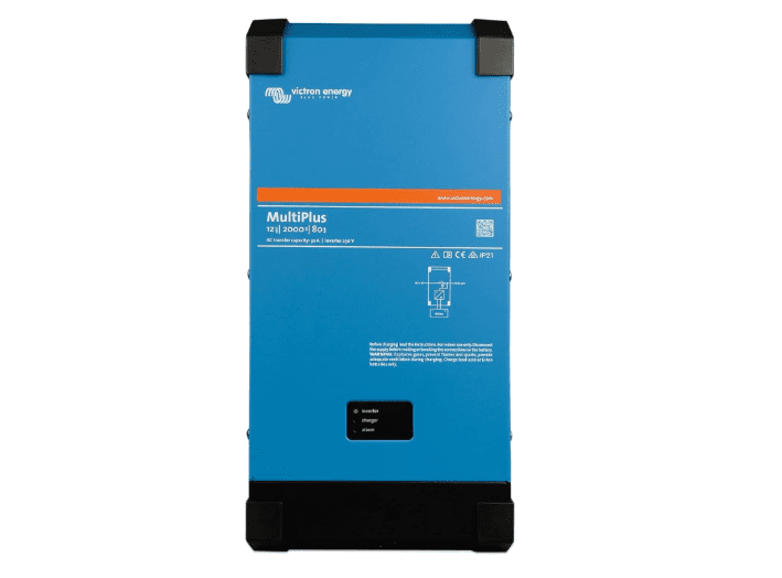 The Victron Energy MultiPlus is a true sine wave inverter and advanced battery charger with adaptive charge technology. Its Power Assist feature prevents generator or shore power overload, and it switches to battery power within 20 ms during outages for uninterrupted supply. Up to six units can run in parallel for higher output, with three configurable for three-phase operation. Professional installation is recommended for safety and code compliance.