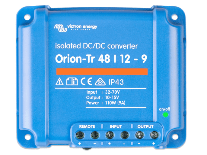 The Victron Energy Orion-Tr 48/12-9A (110W) Isolated DC-DC Converter efficiently steps down 48V to 12V, delivering a stable 9-amp output with IP43 protection when mounted with the screw terminals facing downward. It features a remote on/off connector that eliminates the need for a high-current input switch, allowing control via a low-power or engine run/stop switch. The converter is short-circuit proof, high-temperature protected with automatic output reduction at elevated temperatures, and can be paralleled to increase output current. Screw terminals make installation quick and easy without requiring special tools.