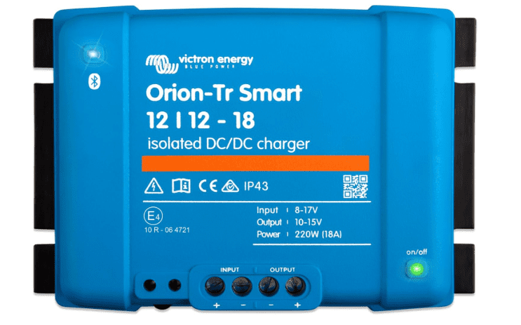 The Victron Energy Orion-Tr Smart DC-DC Charger is a professional three-stage charger designed for safe and efficient dual battery charging in vehicles and boats. Ideal for charging a service battery from an alternator and starter battery, it features built-in Bluetooth for monitoring and control via the VictronConnect app. Compatible with both lead-acid and lithium batteries, multiple units can be connected in parallel to increase output power. Screw terminals ensure quick and easy installation without specialized tools.