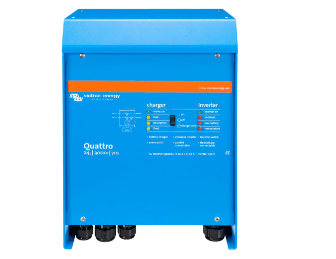 The Victron Energy Quattro 24V 3000VA 70A is a combined 230V inverter and battery charger that can connect to two independent AC sources. It ensures uninterrupted power during grid failures, allowing computers and sensitive electronics to continue operating, and features PowerAssist to prevent overload of limited AC sources like generators or shore power. Up to six units can run in parallel for virtually unlimited power, with options for three-phase or split-phase operation. Professional installation is essential to ensure safety and compliance with electrical codes.