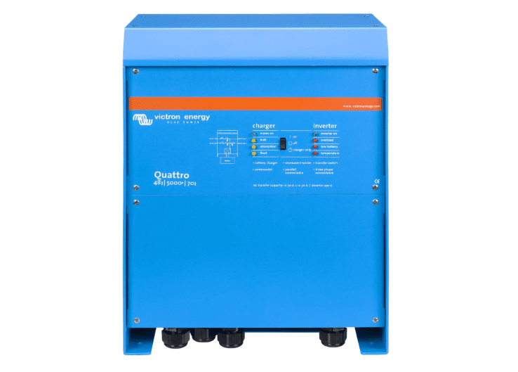 The Victron Energy Quattro 48V 5000VA 70A is a combined 230V inverter and battery charger that can connect to two independent AC sources. It provides instant backup power during grid failures, keeping computers and sensitive electronics running, and features PowerAssist to prevent overload of limited AC sources like generators or shore power. Up to six units can operate in parallel for virtually unlimited power, with options for three-phase or split-phase operation. Professional installation is required to ensure safety and compliance with electrical codes.